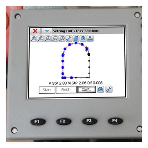 Cuando existe sección teórica asociada, tcpTUNNEL puede guiar la lectura y el replanteo sobre puntos teóricos de la sección, y calcular diferencias respecto a lo proyectado para controlar infraexcavación y sobreexcavación.